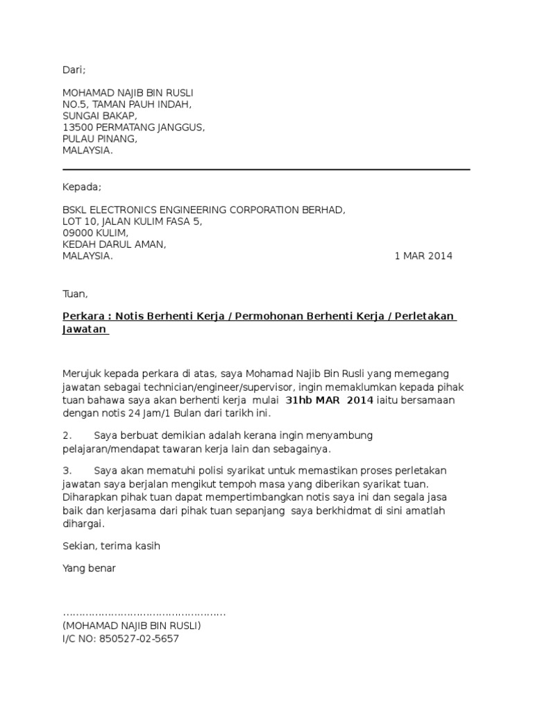 Save save contoh surat berhenti kerja notis sebulan for later. Contoh surat berhenti kerja notis 1 bulan nama pekerja alamat tempat tinggal pekerja tarikh. Surat Rasmi Untuk Berhenti Kerja Terbaik Dalam Bahasa Melayu Dan InggerisResignation latter atau surat rasmi berhenti kerja notis sebulan seminggu atau 24 jam.